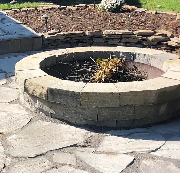 A stunning natural stone retreat in the heart of Plain City. This Pennsylvania Flagstone patio features a custom built-in fire pit with stone veneer, creating a seamless and timeless outdoor living space. The natural variation in the flagstone gives this patio a character and charm that no manufactured paver can match.