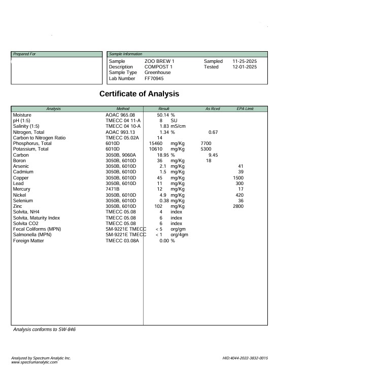 Zoo Brew is an all-natural compost including zoo manure & animal bedding from the Columbus Zoo, horse manure, recycled food & vegetables, leaf humus, and coffee grounds. The unique composition is abundant in nutrients. Excellent for use as a mulch with a natural black color. This makes Zoo Brew great for: